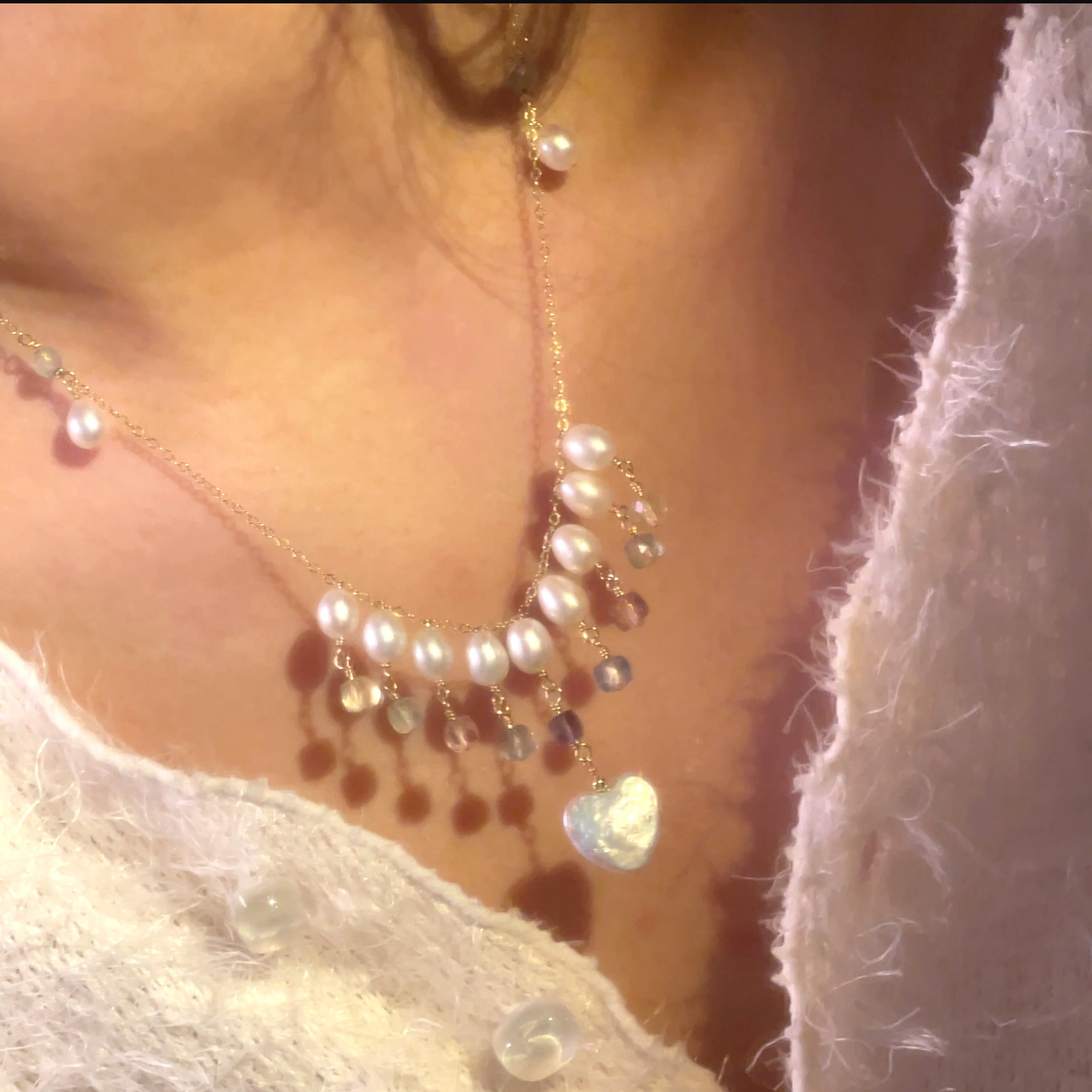 The ANGEL Necklace, a Heart Baroque Pearl & Fluorite Necklace from LING LAN Jewelry, features a lustrous AAA-grade heart Baroque pearl, dreamy colorful Fluorite gemstones, and handpicked freshwater rice pearls. Crafted with tarnish-free 14K Gold-Filled accessories, it can be worn as a delicate necklace with an adjustable extension. Its luminous heart-shaped pearl, subtle rainbow glow, and elegant swaying design make it a statement piece for romantic gifting or layering with other jewelry.