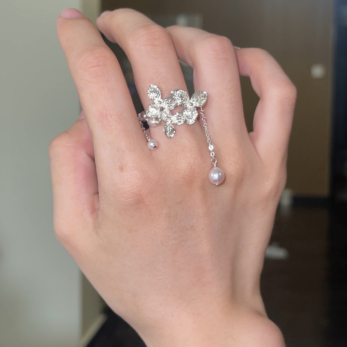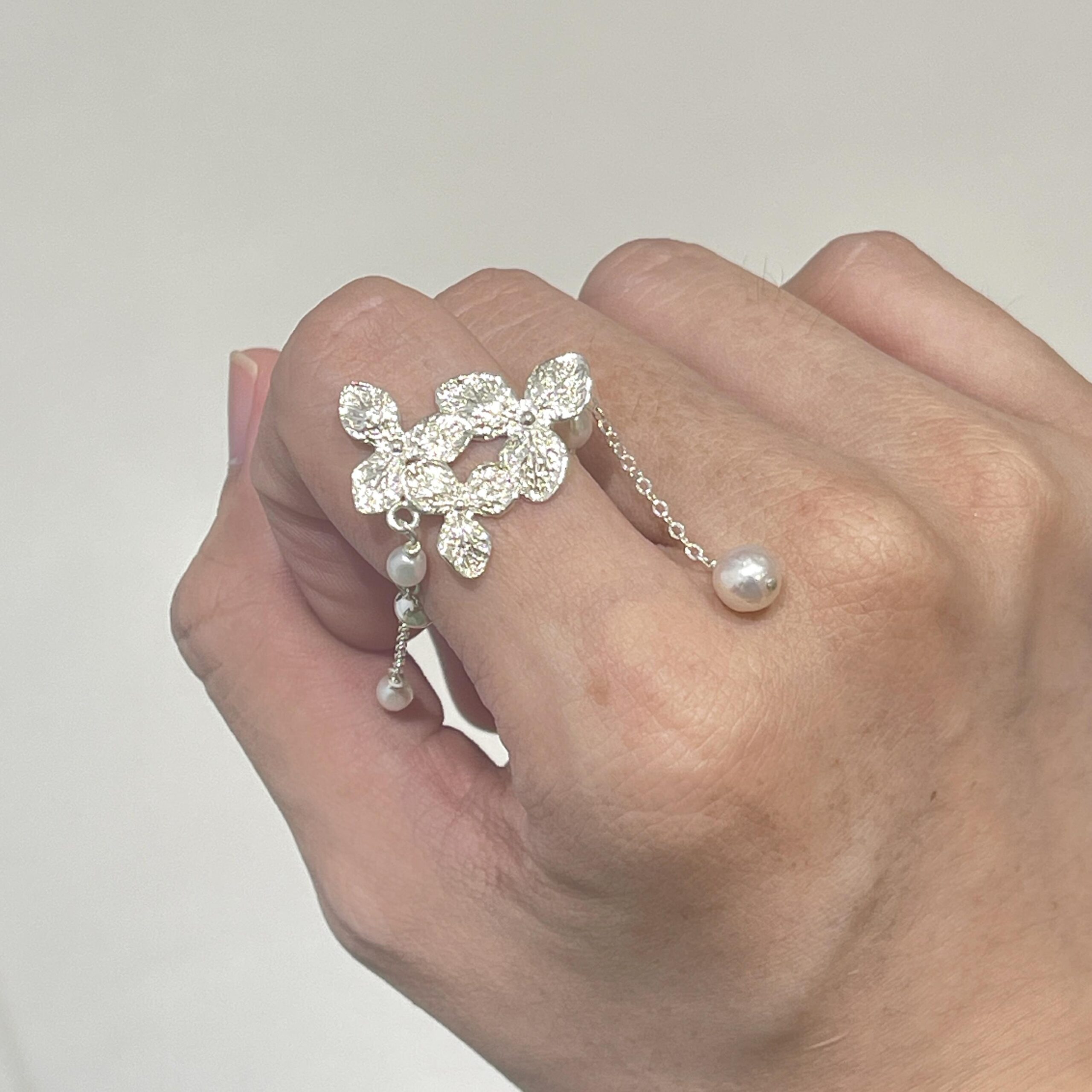 Inspired by Jupiter’s enchanting moon, the ELARA Ring by LING LAN Jewelry embodies celestial motion and romantic elegance. This Sterling Silver Pearl Ring features a delicately crafted flower, luminous freshwater pearls, and fine chains designed to sway gracefully with every movement, evoking poetry, motion, and timeless romance.