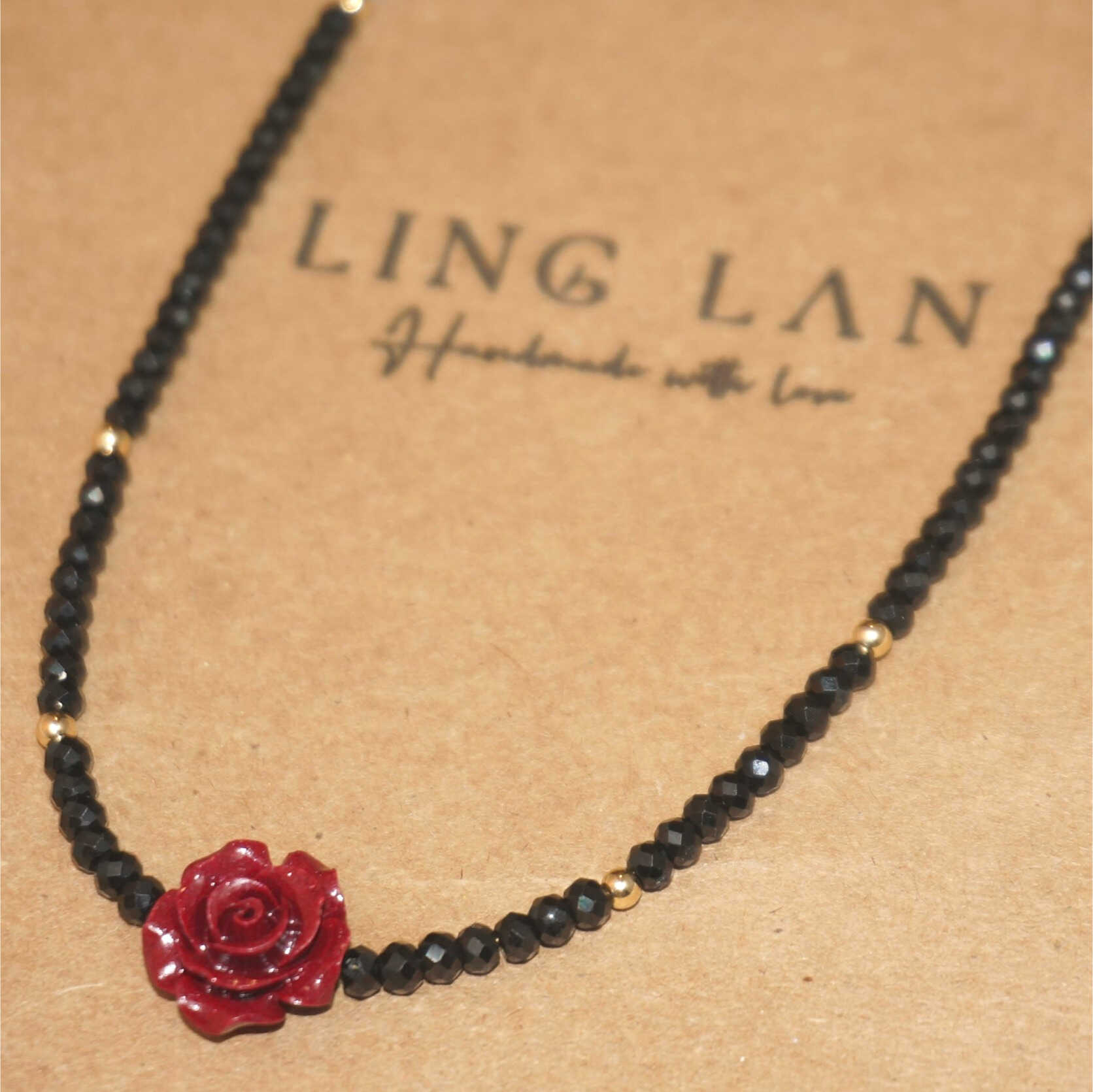 A protective Cinnabar Rose Necklace from LING LAN Jewelry — burning cinnabar rose, black spinels, and lustrous freshwater pearls bring courage, warmth, and elegance.