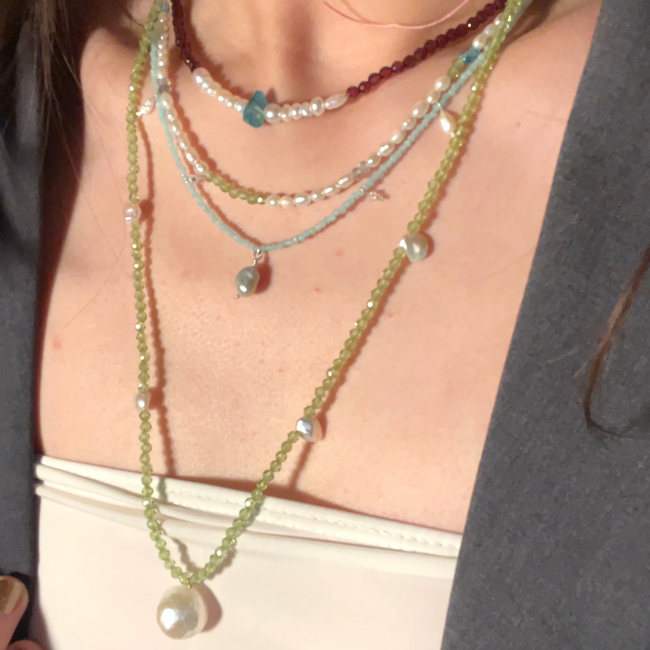 Blue Apatite is a ferry to traverse the seas of consciousness, promoting balanced energy, emotional stability, and healthy self-confidence. Paired with Garnet and pearls, the necklace encourages calm, wisdom, and inner harmony.
