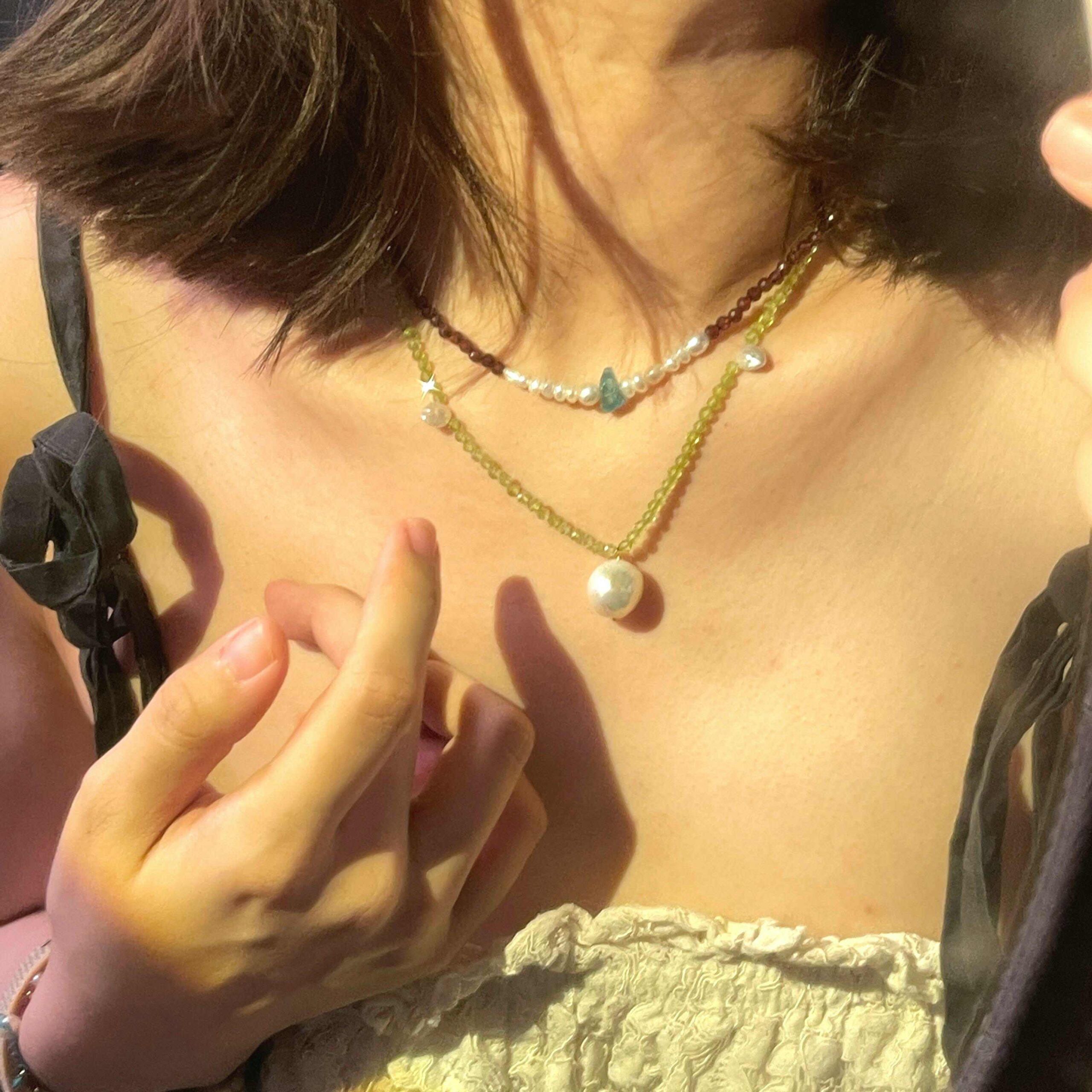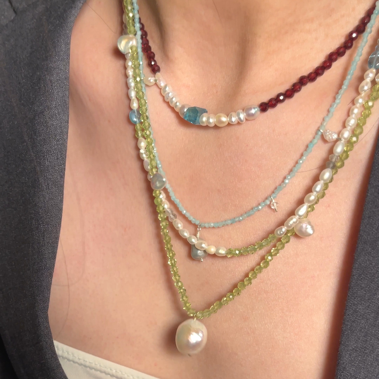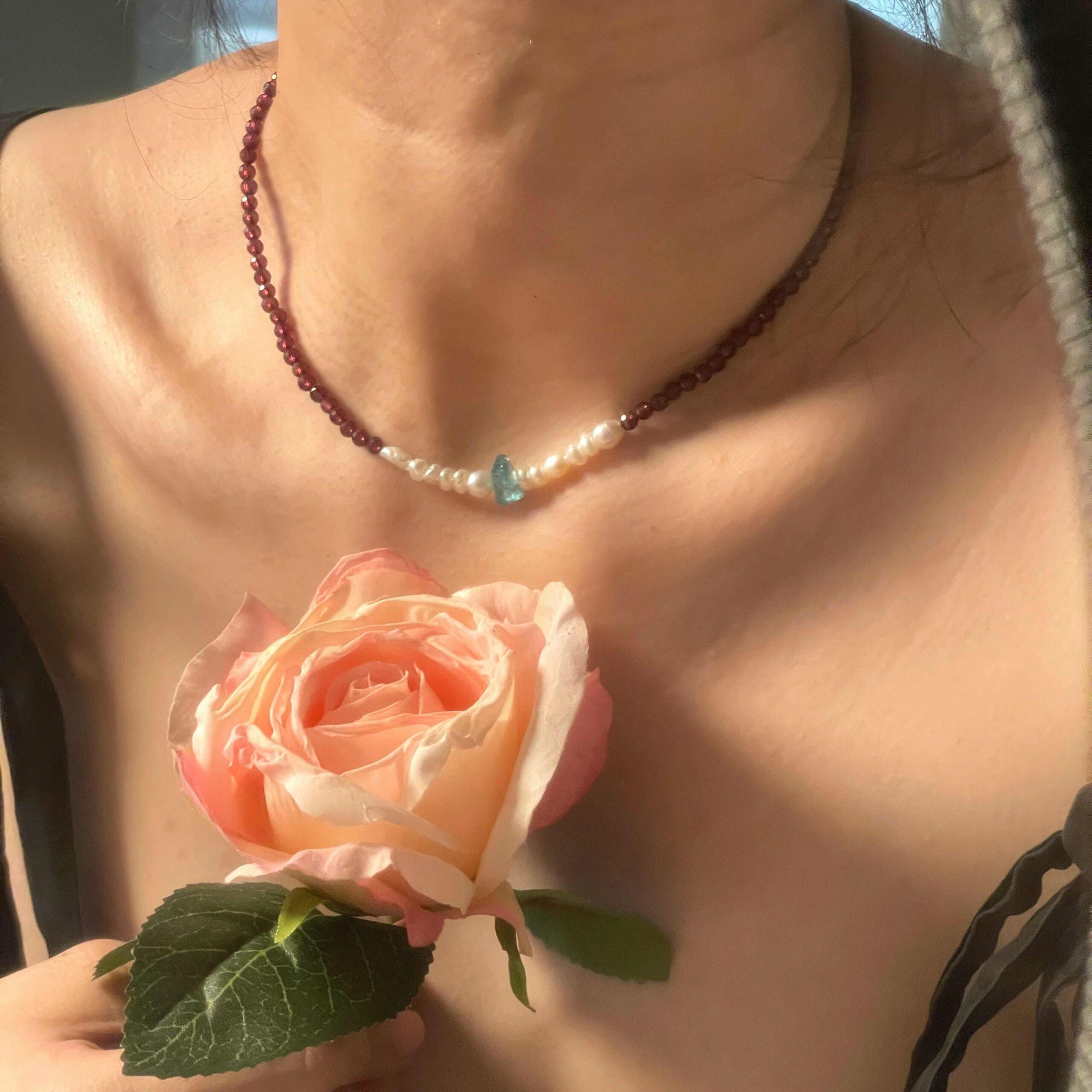 The LUCENT TIDE Necklace by LING LAN Jewelry embodies romantic elegance and serene beauty. Featuring high-quality Garnet as the main stone, complemented by a 5mm Blue Apatite accent and hand-selected freshwater pearls, this Garnet Necklace with Blue Apatite Accent sways gracefully around the neck or wrist, evoking the refreshing flow of the tide.