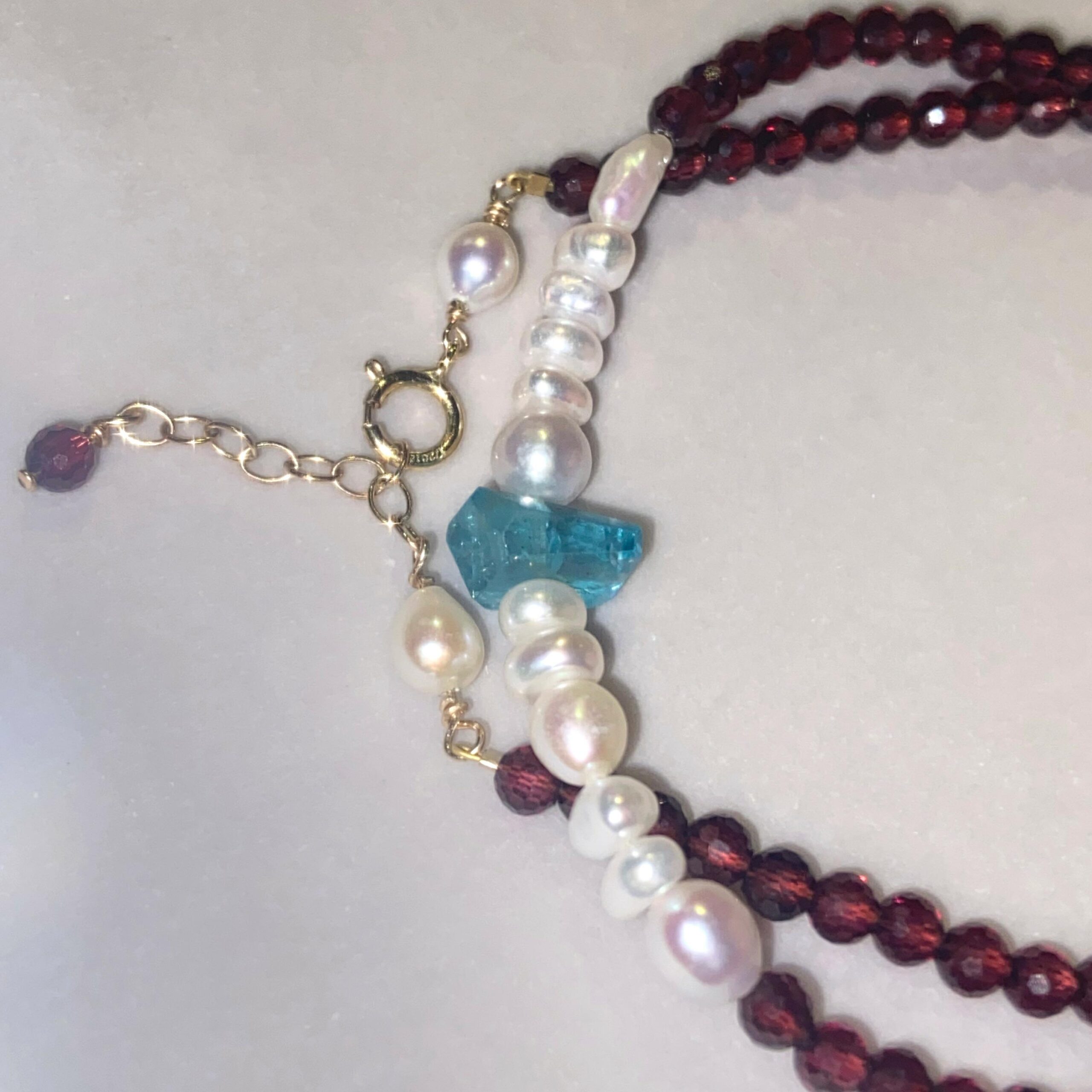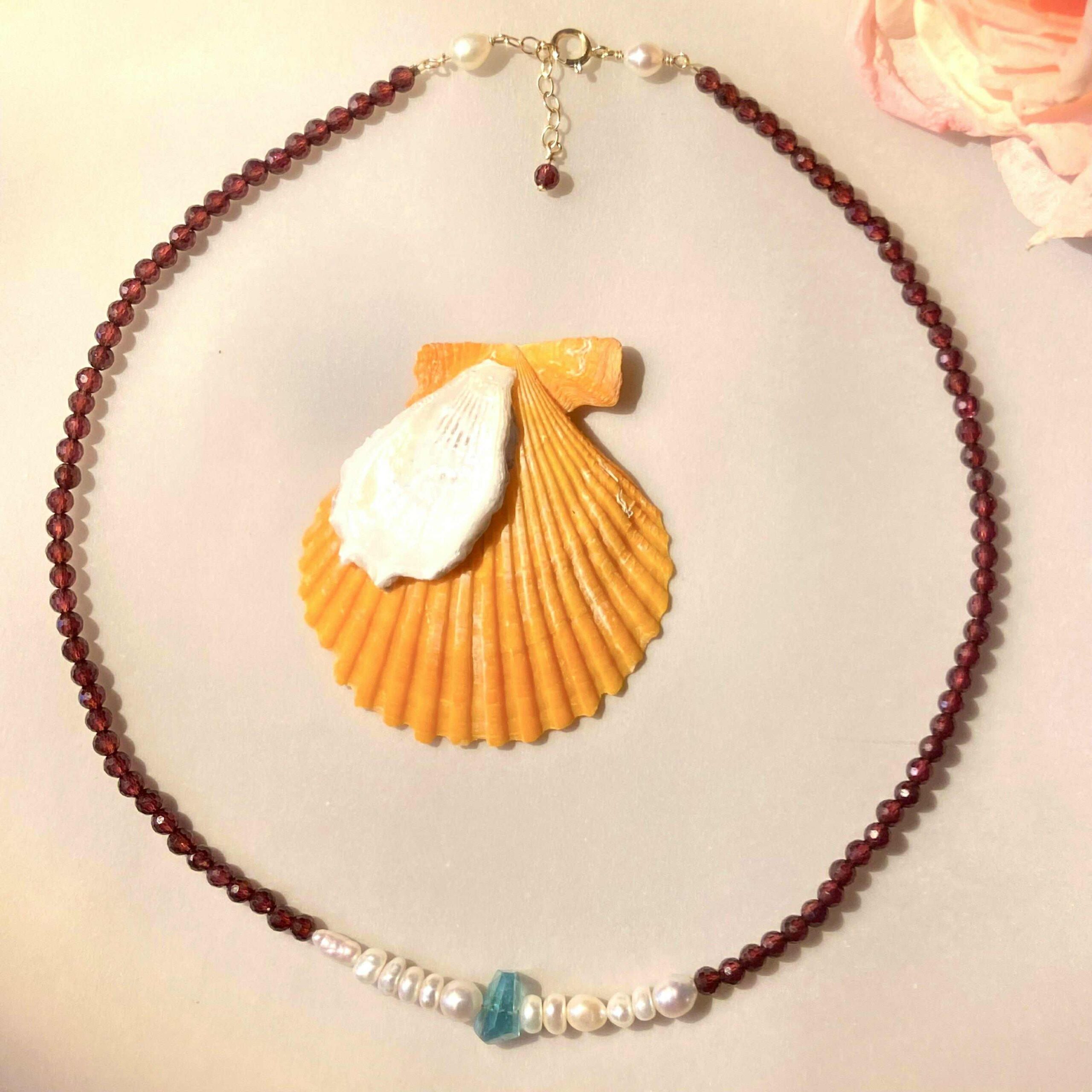 The LUCENT TIDE Necklace, a Garnet Necklace with Blue Apatite Accent from LING LAN Jewelry, features high-quality Garnet as the main stone, a dreamy 5mm Blue Apatite accent, and AAA-grade lustrous freshwater pearls. Crafted with tarnish-free 14K gold-filled accessories, it can be layered with other jewelry for a timeless and elegant look. Perfect for everyday wear or special occasions, this necklace sways gracefully around the neck or wrist, bringing romantic elegance, balanced energy, and a sense of calm to the wearer.